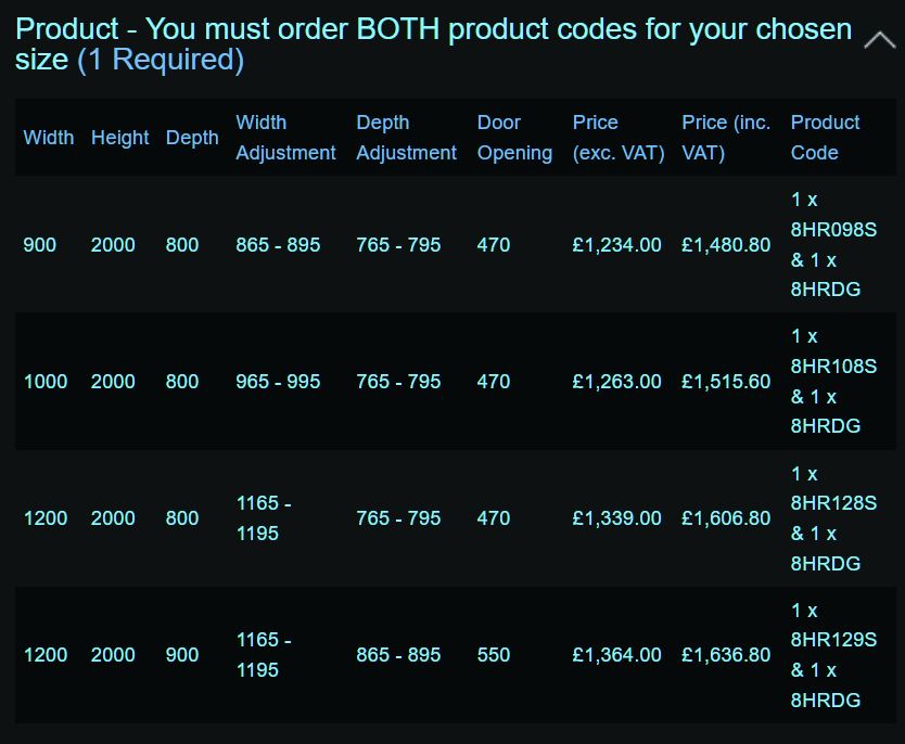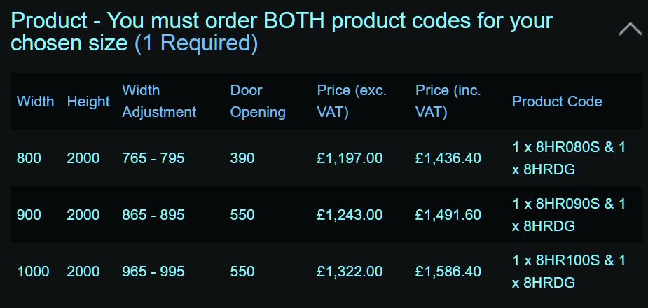 | Size | Offset, x2 1000 x 2000 x 800mm, (1 x 8HR108S & 1 x 8HRDG), Offset, x2 1200 x 2000 x 800mm, (1 x 8HR128S & 1 x 8HRDG), Offset, x2 1200 x 2000 x 900mm, (1 x 8HR129S & 1 x 8HRDG), Offset, x2 900 x 2000 x 800mm, (1 x 8HR098S & 1 x 8HRDG), Quadrant, 2 x 1000mm, (1 x 8HR100S & 1 x 8HRDG), Quadrant, 2 x 800mm, (1 x 8HR080S & 1 x 8HRDG), Quadrant, 2 x 900mm, (1 x 8HR090S & 1 x 8HRDG) |